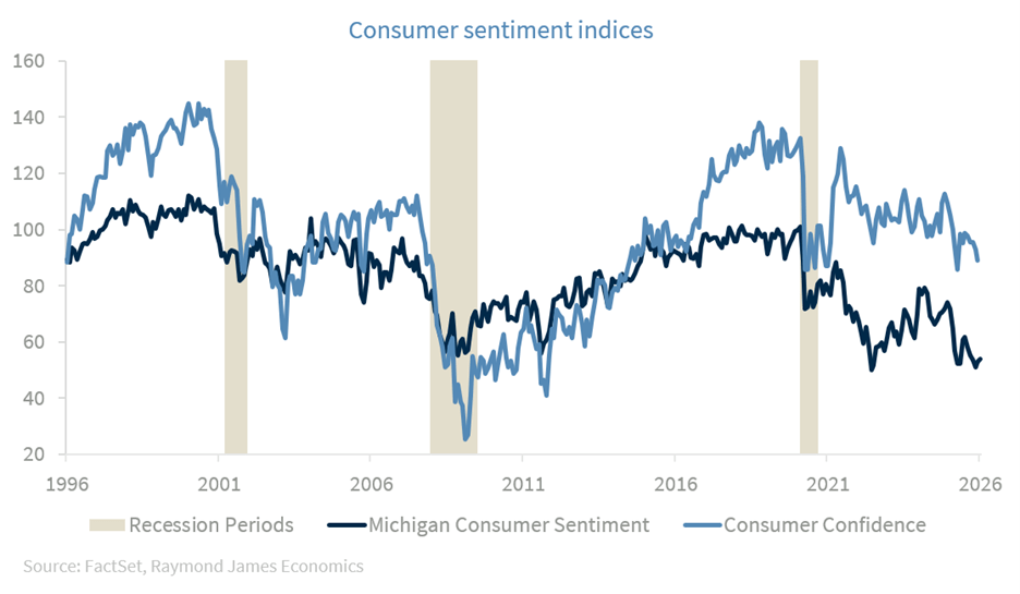 Americans are in a very similar environment today as during the Biden administration in terms of the existing mismatch between the strength in economic activity, on the one hand, and the failure of consumers to feel good about it, as reflected by consumer confidence as well as consumer sentiment indices (graph below). This points to a fundamental detachment between the economy and the benefits accruing to individuals and households, something that will keep politicians guessing and is typically not a good omen for incumbents, especially during a midterm election year. But we are not political analysts so we will skip any potential political consequences from this mismatch.