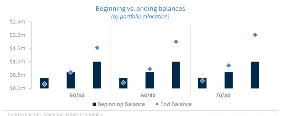 If we look at a simple 50/50 portfolio in 2016, without annual rebalancing, and assume a steady $50,000 annual withdrawal, the picture today is far better than many would have expected a decade ago. Thanks to a strong market cycle, most notably the performance of US equities, retirees who began 2016 with at least $600,000 in savings would still have slightly more money today, even after 10 years of withdrawals. A household that started with $1 million would now be sitting on roughly $500,000 more than they began with.